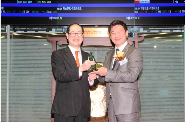 中國鋁罐控股有限公司執(zhí)行董事兼主席連運增先生(右)至送紀(jì)念品予香港聯(lián)合交易所代表 上市委員會主席李嘉士先生(左)