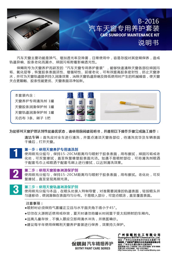 保賜利專為天窗養(yǎng)護而研發(fā)的“汽車天窗專用養(yǎng)護套裝”,能夠快速清除天窗各部位頑固污垢、氧化層等,恢復膠條表面活性、增強韌性、延緩老化,可有效提高膠條密封性,防止天窗滲水,并可為天窗軌道提供持久潤滑效果,消除天窗軌道異響及降低使用時產(chǎn)生的機械噪音,使天窗關合更順暢、膠條性能更優(yōu)、天窗表面潔凈如新。