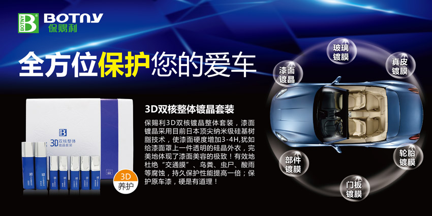 保賜利3D雙核鍍晶整體套裝,漆面鍍晶采用目前日本頂尖納米級硅基樹脂技術(shù),使漆面硬度增加3-4H,猶如給漆面罩上一件透明的硅晶外衣,完美地體現(xiàn)了漆面美容的極致!有效地杜絕“交通膜”、鳥糞、蟲尸、酸雨等腐蝕,持久保護(hù)性能提高一倍;保護(hù)原車漆,硬是有道理!